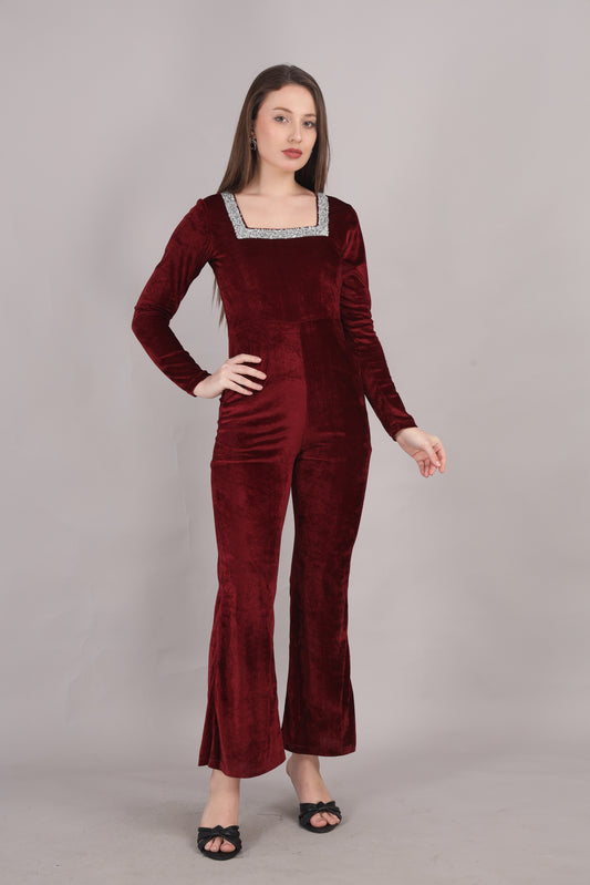 Maroon Velvet Square Neck Jumpsuit